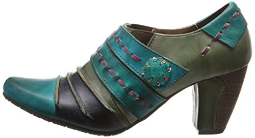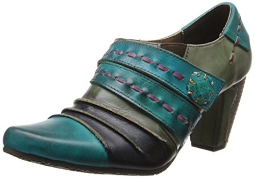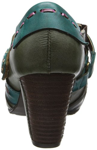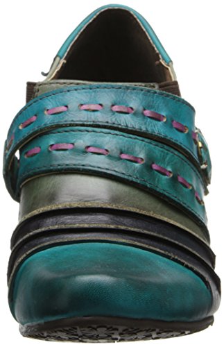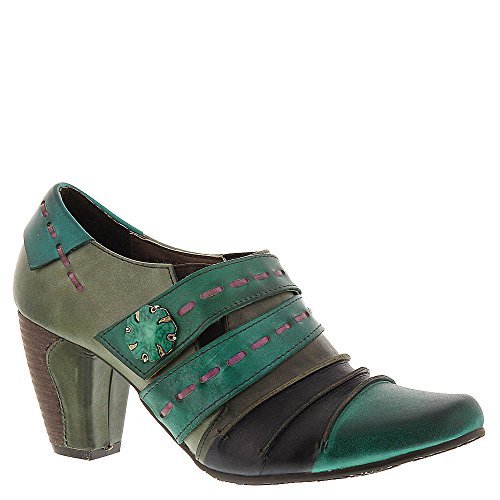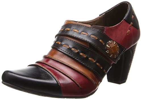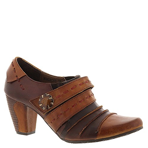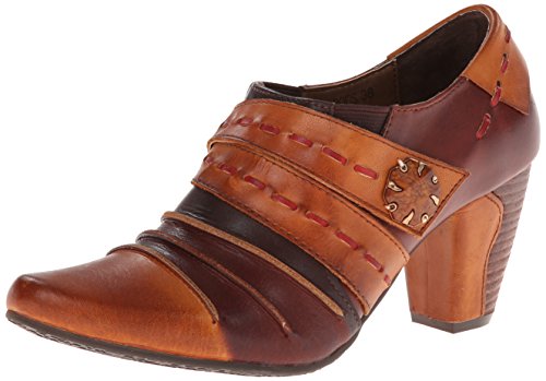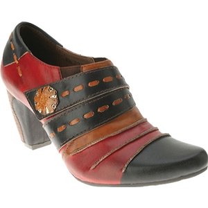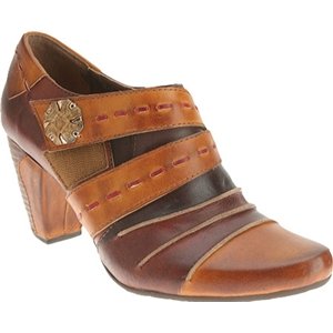 Picante offers a trio of colors, artfully combine in a cascade of antiqued leather in wondrous fashion. Two straps grace the upper front, marked by leather basting stitches and a vintage-look button of wood and metal. The top flap is attached by Velcro, with elastic wedges on each side of the foot for flexibility and extreme comfort. The final touch on this vintage beauty is a leather-wrapped faux-wood 2-1/2 heel.Feature
