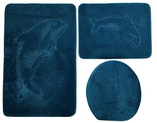 3-teilige Badgarnitur im Farbton petrol, bestehend aus - 1 Badezimmerteppich 85 x 55cm - 1 WC-Vorleger für Hänge-WC, 54 x 43cm - 1 WC-Deckel-Bezug 43 x 40cm Der Bezug für den WC-Deckel ist mit einem Gummizug versehen. So ist kein schnüren und verknoten notwendig. Die Badgarnitur ist einfarbig, auf den Teppichen mit Delphinmotiv.Feature