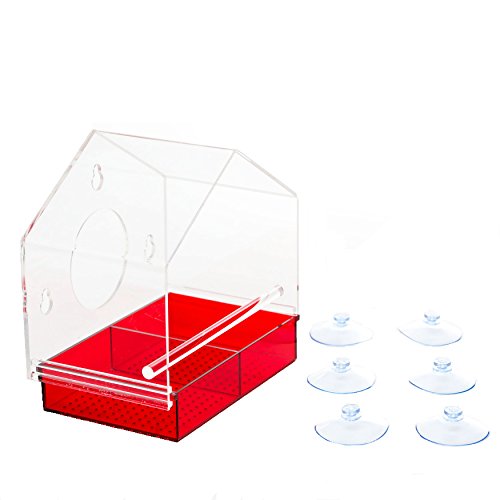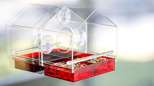 Window Bird Feeder with Strong Suction Cups Attracts Wild Birds, See Through Design and Colored Removable Tray, 3 EXTRA Suction Cups, Squirrel Proof - 100% Guarantee by Outdoor Amor (Red)