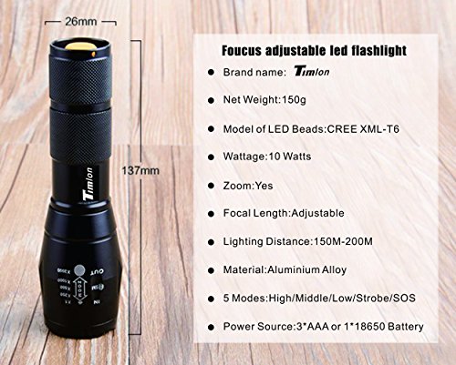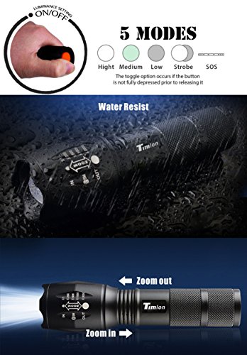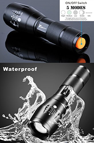 Timlon 2 Pack LED Tactical Flashlight Cree XM-L T6 2000 Lumen 5 Switch Modes Adjustable Focal Length Zoomable and Water-resistant LED Flashlight(black)