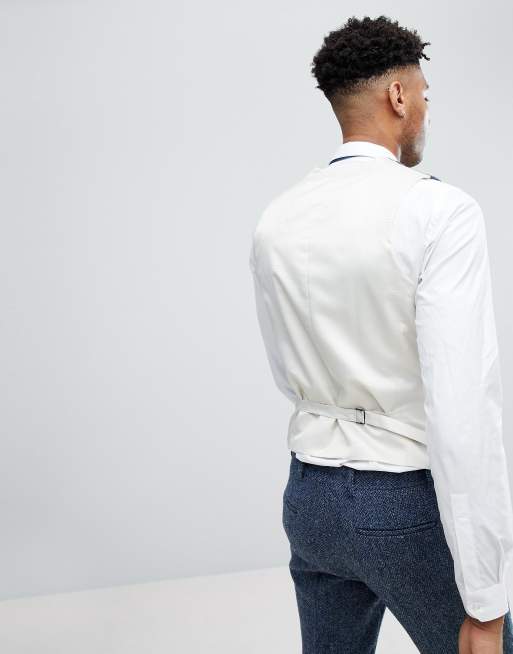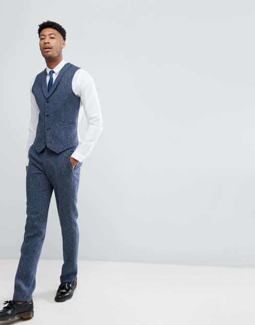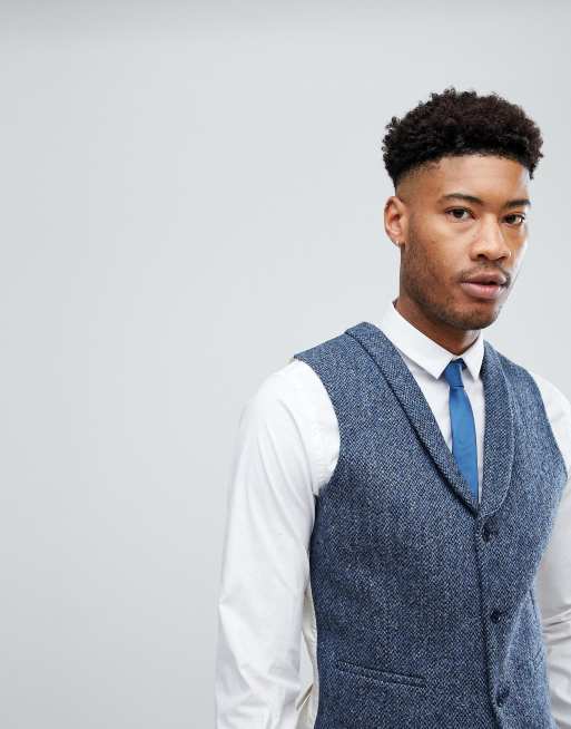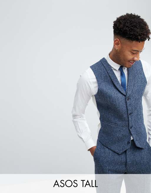 ASOS TALL Slim Suit Vest in 100% Wool Harris Tweed In Blue Mini Check