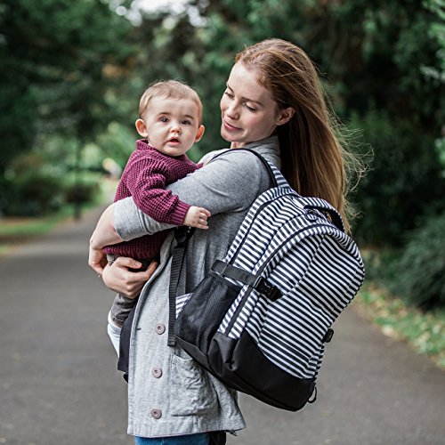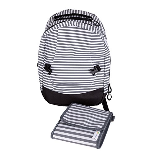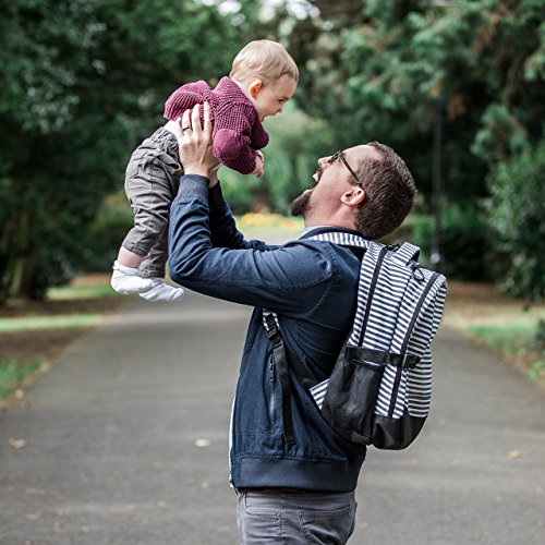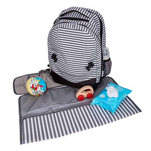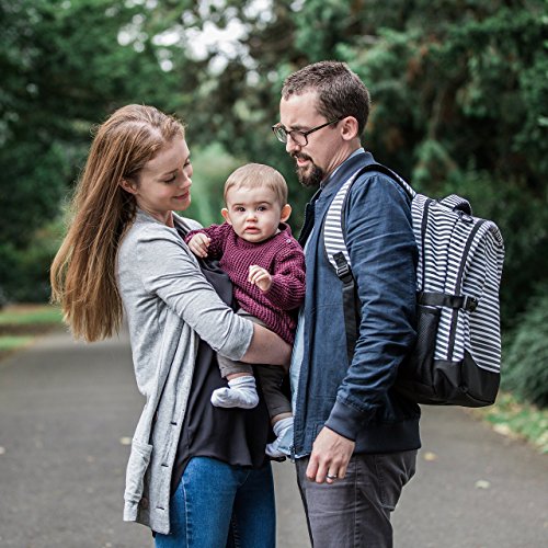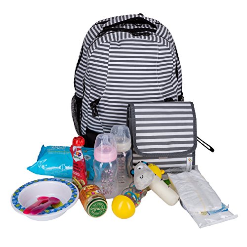 This diaper bag backpack is made from extremely high quality, durable materials. It's designed to last, no matter what parenthood throws at it. From the canvas, to the zippers, right down to the stitching, we've made sure that it's strong and dependable enough to be used heavily every single day. It's easy to clean, and the grey and white striped pattern is designed to minimize the appearance of wear and dirt.