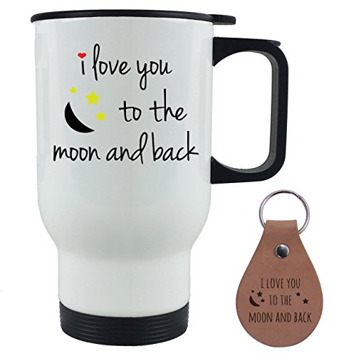 I Love You To The Moon and Back 14 Ounce White Stainless Steel Travel Coffee Mug with Push Down Lid with Leather Keychain