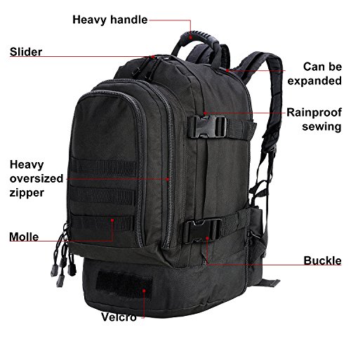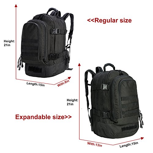 3 Day Expandable 39 - 64 L Outdoor Tactical Backpack Military Sport Camping Hiking Trekking Bag 08002A This backpack is designed to support all your outdoor adventure and hiking needs. It features and extra-large expendable main compartment to fit everything you need for a day hike, overnight or three trip. It can be compressed to 39 liters or expanded to 64 liters of carrying space. Side parachure claps allow for tightening to provide a compact , easy to transport pack.