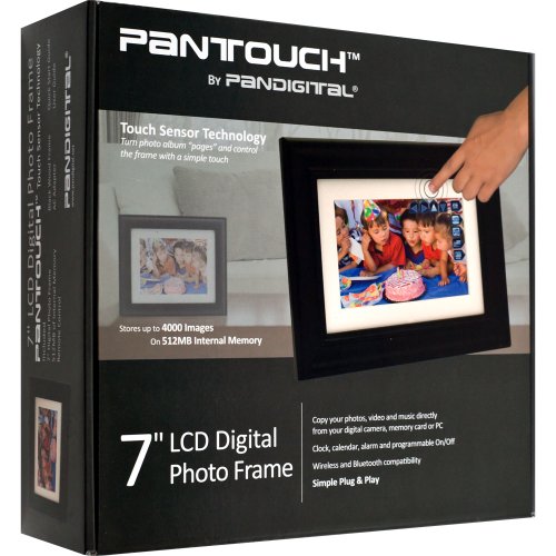 -. Binding : Electronics -. Brand : PanDigital -. Color : black -. EAN : 0843967070026 -. Feature : Features include: Store up to 4000 images on 512MB of internal memory Built in 5-in-1 card reader: SD Card MMC Card MS Card MSPro Card XD Card / XD Card Beveled, black frame to match any color Transfer files easily from your digital camera, memory card or PCStore thousands of photos, songs or videos Wireless and Bluetooth Compatibility / Supports JPEG, MP3 and popular video file formats. Clock, Calendar, Alarm and Programmable ON/OFF Pantouch Touch Sensor Technology: Turn photo album 'pages' and control the frame with a simple touch / Swiveling Stand for Vertical or Horizontal Display Wall Mountable Dimensions: 1. 5 x 10 x 7. 25 inches / Stylish Black Wood Digital Photo Frame Featuring PanTouch Touch Screen Technology - 512MB of Internal Memory Holds up to 2,000 Compressed Images / 7.0 PanTouch Viewable LCD Display - Bluetooth Wireless Accessories Available - 800 x 480 Screen Resolution - Contrast Ratio 400:1 - JPEG Video, Music / 6 in 1 Memory Card Reader - SD Format / Calendar / Analog Clock / Auto On/Off / Remote Control - USB Cord - Quick Start Guide - Manual -. Label : Pandigital -. Manufacturer : Pandigital -. Model : 72-W01T -. MPN : 72-W01T -. PackageQuantity : 1 -. PartNumber : 72-W01T -. ProductGroup : Photography -. ProductTypeName : CAMERA_OTHER_ACCESSORIES -. ProductTypeSubcategory : digital-frames -. Publisher : Pandigital -. Size : 7-Inch -. Studio : Pandigital -. Title : Pandigital 72-W01T 7-inch Touchscreen Digital Picture Frame (Black) -. UPC : 843967070026 -. Warranty : 90 Days Parts & Labor