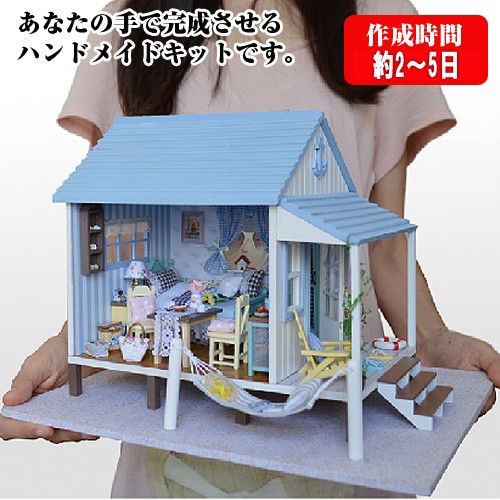 夢と憧れのキット!自分の手で完成させる感動のインテリアハウス! 通常価格7452円の処、8%OFF特別価格6782円にて限定販売! 「マリンブルーの海、爽やかな海風、潮の香り...」目に浮かんでくるシチュエーション!!それは、海岸沿いに建てられた、もう一つのあなたのプライベートハウス。『青い屋根』『白い壁』、『テラスに置かれるウッドチェア』、中に入れば、『悠々自適なライフスタイル』、外には、『ハンモック』『ボート』とオーシャンリゾートグッズ。ギミックは「オルゴールモード」「LED点灯モード」から気分に応じて交換できます。Your ideas make your life more fun!ギミックは、【ナイトモード(LED3灯)】、【オルゴールセンサー】から選んで装備できます。LED3灯で、夜のビーチハウスをムード感やっぷりに鮮やかライトアップ演出。音に反応するサウンドセンサー付オルゴールで、心に響くあの頃の青春の日...。ミニチュアながら、ルーム内部まで精巧さに拘り完成させる、夢と想い出が詰まったインテリア・コレクション!!■完成サイズ:約(幅)30x(奥)26x(高)21.5cm