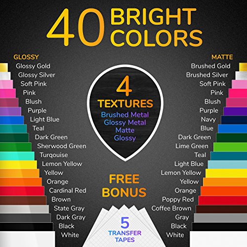 - ✅ GREAT VARIETY WITH 4 FINISHES - This Permanent Vinyl Sheet set contains all the variation you need and more, in our set you get 40 Sheets Vinyl with 4 best different finishes at top 40 most popular of colors, so each one is different! ● Our set include 18 matte vinyl, 18 glossy vinyl, 2 brushed metallic vinyl and 2 sheets glossy metallic vinyl