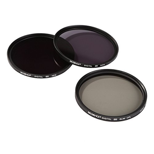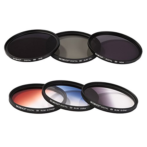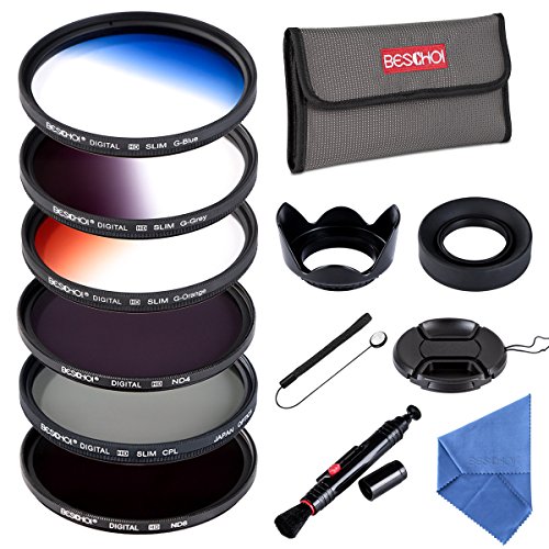 Kit includes Beschoi 58mm Professional Filter Kit (Circular Polarizer CPL, Neutral Density ND4,Neutral Density ND8, Graduated Color Orange, Blue, Gray)+Petal Lens Hood + Collapsible Rubber Lens Hood + Center Pinch Lens Cap + Cleaning Cloth + Cleaning Pen + Cap Keeper + Filter Pouch Bag
