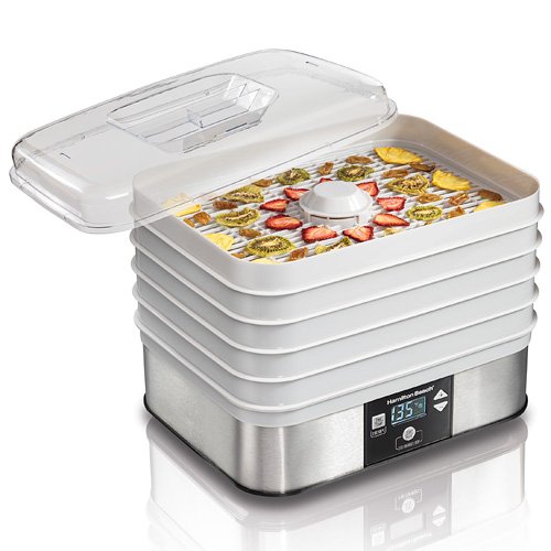 Hamilton Beach - Food Dehydrator Great for drying fruits veggies jerky and more Create healthy snacks without additives or preservatives 5 Stackable drying trays 1 Fine-mesh sheet for drying small foods 48 Hour timer Auto shutoff Adjustable digital thermostat: 40C-70C/100F-160F Clear lids for easy viewing Continuous airflow provides even drying No need to rotate trays Provides 500 powerful watts Food zones are BPA free
