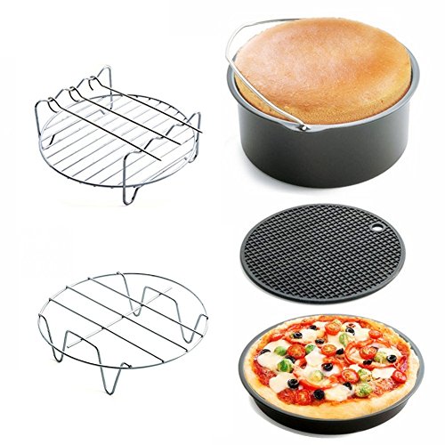 5-SETS: This Air Fryer Accessory Kit includes 1 Cake Barrel, 1 Pizza Pan, 1 Metal Holder, 1 Multi-Purpose Rack with Skewers and 1 Silicone Mat. You can make different delicious food by each accessories.