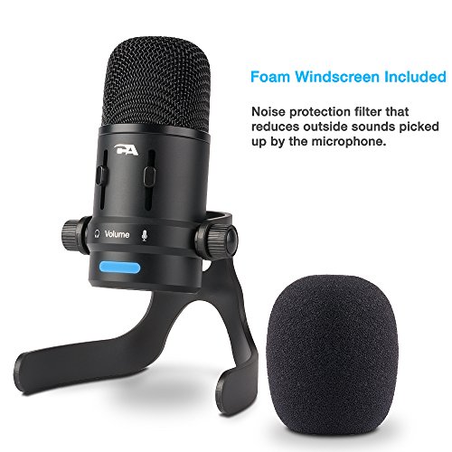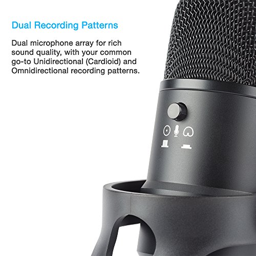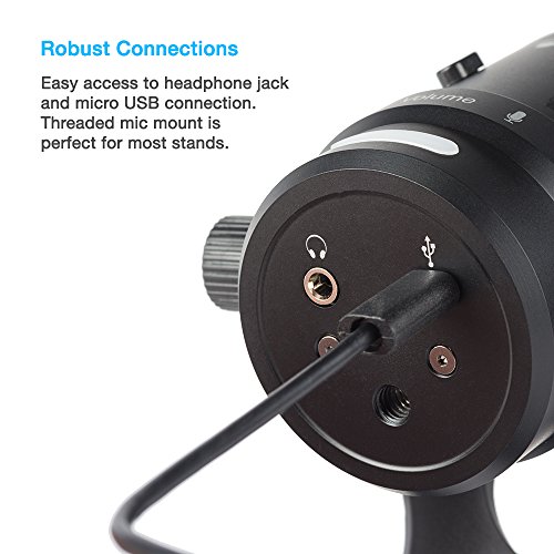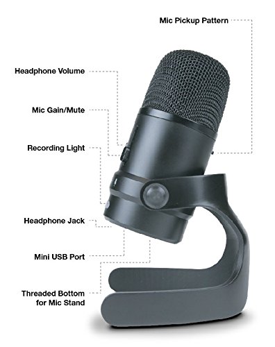 -. Feature : CLEAR AUDIO: With dual polar recording patterns; cardioid (directional) and omnidirectional, this condenser mic produces clear, crisp audio for professional recordings at home, the office or studio. Plus zero-latency monitoring promises no lag time between speaking and listening during recordings. / MULTI-PURPOSE RECORDING: The sound and audio quality makes this microphone ideal for podcasts, vlogging, voice-overs, vocal, singing, music, broadcasts, interviews, videos, gaming, YouTube and Skype. / EASY TO USE: Simply plug in and play, no installation needed. Connect USB cable directly to your Mac, PC or any electronic device with a USB connection. Convenient controls on microphone gives you full control while recording, easily adjusting the mic pattern, headphone volume, microphone volume and mute control. It also includes a 3.5mm headphone output. / HIGH QUALITY DESIGN: 7 inches in height and crafted from industrial-grade robust components, including die-cast anodized aluminum body and stand, with pro-glide controls. This professional level instrument will provide years of service. / ACCESSORIES INCLUDED: Microphone includes adjustable angle desk stand, foam windscreen and 1.5m USB cable. The mic is also threaded on the bottom if you choose to use it with a separate mic-stand. Includes 1 year hassle free warranty.