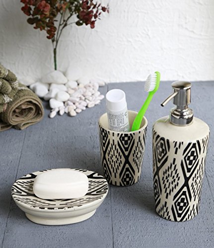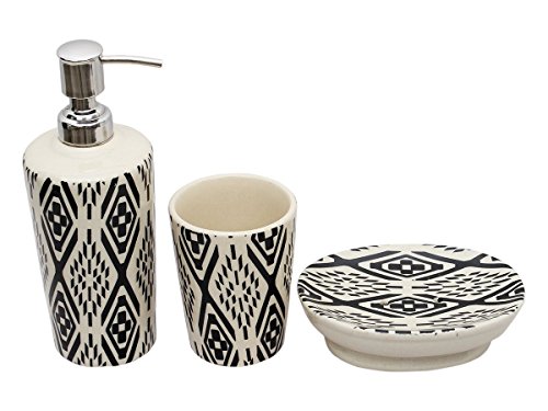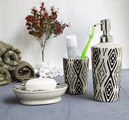 Deluxe Ceramic Bathroom Set Accessories of Soap Dish Soap Dispenser and Toothbrush Holder Tumbler 3 Pc Trendy Monochrome Style Holders Organizers