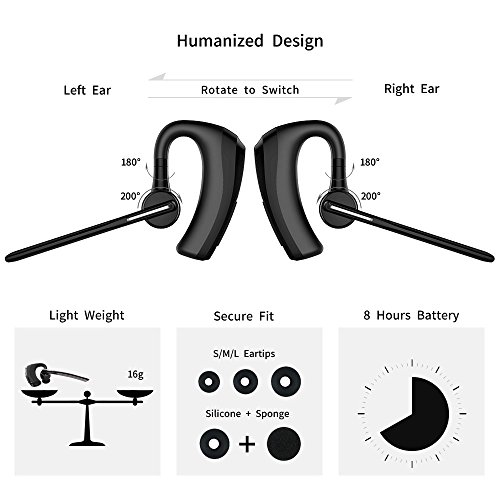 【Comfort All Day Long】Ergonomic ear hook structure with 3 sizes of soft silicone eartips can ensure a secure fit for different people. Creative design of 180°Rotated Microphone & Headset Arm allows a flexible adjustment for smooth switch to your left or right ears. Also, its soft & lightweight material can always keep the comfort for long time wearing without burden, and also durable for frequent using.