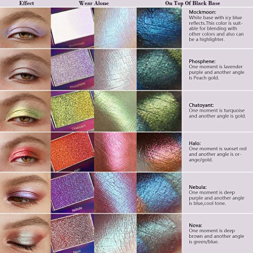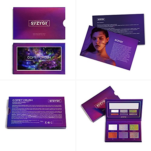 -. Binding : Misc. -. Brand : SYZYGY -. Color : Blue/Brown/Gold/Green/Orange/Purple/Red/Turquoise/White -. EAN : 0610877171194 -. Feature : Duochrome Palette:SYZYGY COMET CRUSH palette contains 6 highly pigmented holographic chameleon glow pressed powder in it. It goes beyond everyday cosmetics to give you a powerful makeup experience. Suit for different occasions, like casual, salon, party, wedding, etc. Naturally beautiful or wild dramatic makeup look, whatever you want! / Unique Colors:Inspired by the colorful and mysterious nebula, this palette appears to have color shifts when viewed at various angles and lighting. They all reflect at least two striking bright glitter shimmer colors at once, so you can use alone or over products to create a multi-dimensional effect. A unique experience, a mermaid's song which you must not resist. / Ultra-pigmented & Multi Uses: Long-lasting, Brighten, Easy to Wear, Waterproof. These 6 most pigmented and velvety-smooth duo chroma colors blend well to the eyes with no fallouts or oxidization. The effect is super wet. Perfect used on its own but also a splendid top coat put on a black base or on Under Pressure to enhance its petrol base. Can be used on top lip, face, highlight, legs and body! / Cruelty-Free&Vegan:SYZYGY does not conduct, condone, nor endorse testing on animals. All our products meet the specifications and requirements of cosmetics criterion in USA and the EU. / 3D Eco-Packaging : With 3D outlook of fancy nebula, this palette has a big mirror inside and it uses eco-packaging with a magnetic lid, which is very portable for travel. Girls, It's the new product experience P.R.Ice, ORDER NOW! -. IsAdultProduct : 0 -. Label : SYZYGY -. Manufacturer : SYZYGY -. MPN : 7E01 -. NumberOfItems : 1 -. PackageQuantity : 2 -. PartNumber : 7E01 -. ProductGroup : Beauty -. ProductTypeName : BEAUTY -. Publisher : SYZYGY -. Size : 5.38*3.22*0.55inch -. Studio : SYZYGY -. Title : SYZYGY Eyeshadow Palette, Duochrome Highlighter Eye Makeup Palette, Holographic+Shimmer+Sparkly+Glitter Eyeshadow Vegan Cosmetics, 6 Multicolours -. UPC : 610877171194