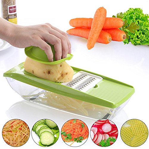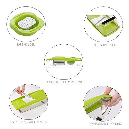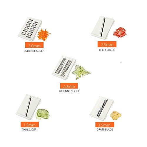 ✅ MULTITASK: 5 interchangeable sharp blades made from high quality stainless steel, you can use it to chop various vegetable or fruits. Blades are easy to change so you don't have to worry about cutting yourself.