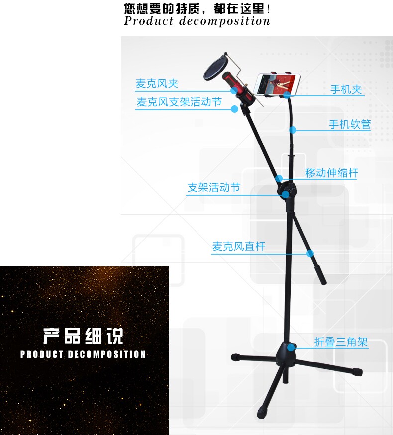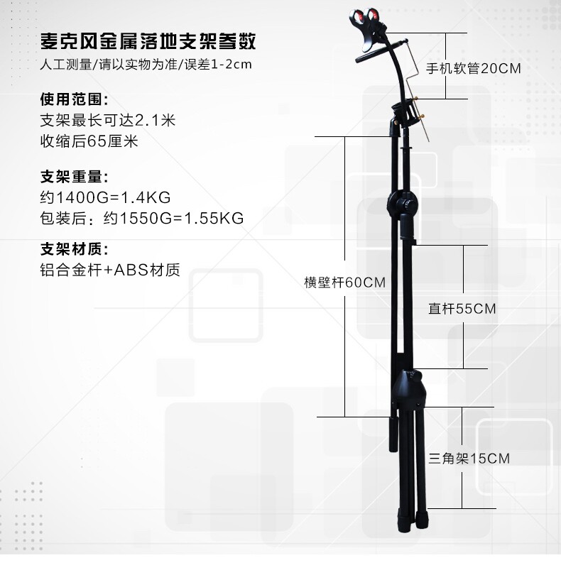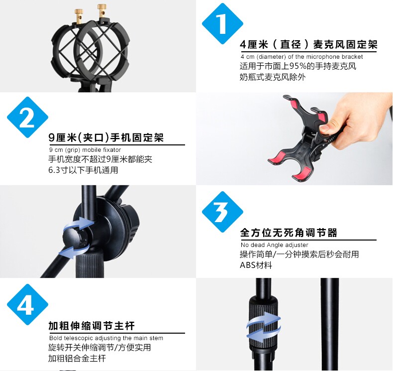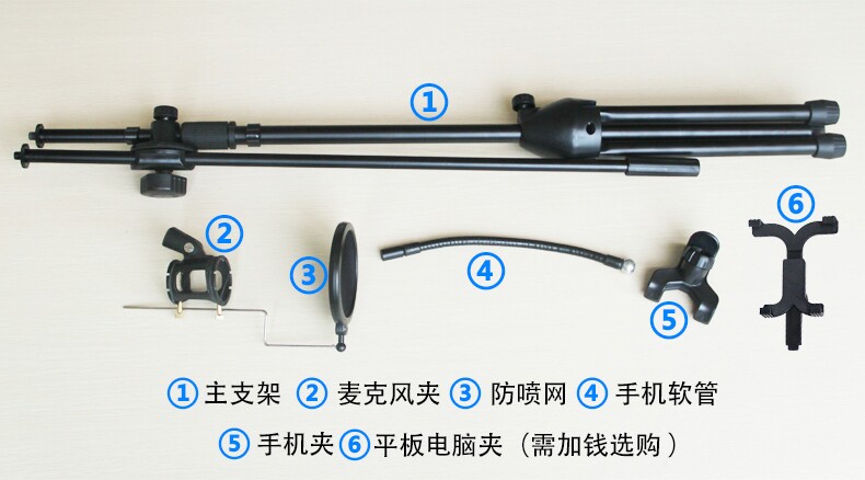 本款K歌支架适用于手机K歌,录视频等!!与K068款结合可以让K歌体验更好!!本款配有 手机夹和IPAD夹!全套齐全,即买即用,无需领购其他。支架全部为金属材质,质量好,有档次!!