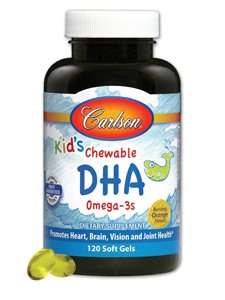 To provide your children with the nourishing benefits of DHA Omega-3 oil, have them try the fun and tasty Carlson for Kids Chewable DHA today. Each orange-flavored chewable soft gel provides 100 mg of DHA. DHA is vital for children's healthy brain development and vision. DHA is important for brain and eye development and function throughout the life stages, but is particularly important during the first two years of life and early childhood. Between birth and five years of age, the human brain increases approximately 3.5 times in mass. During this time it is important that children consume adequate amounts of DHA in their diet to support this period of rapid brain and eye growth and development.ChewablePurity Potency Freshness Guaranteed100 mg per soft gelBursting orange flavorSize: 120 SoftgelsActive ingredients: Natural tocopherols, natural orange and tangerine flavors. Soft Gel Shell: Beef gelatin, glycerin, water. We cannot accept returns on this product.The content on this site is not intended to substitute for the advice of a qualified physician, pharmacist, or other licensed health-care professional. The products may have additional information and instructions on or inside the packaging that you should carefully read and follow. Contact your health-care provider immediately if you suspect that you have a medical problem. This product may not have been evaluated by the Food and Drug Administration and is not intended to diagnose, treat, cure, or prevent any disease or health condition. Medicine Form: Soft GelsFeature