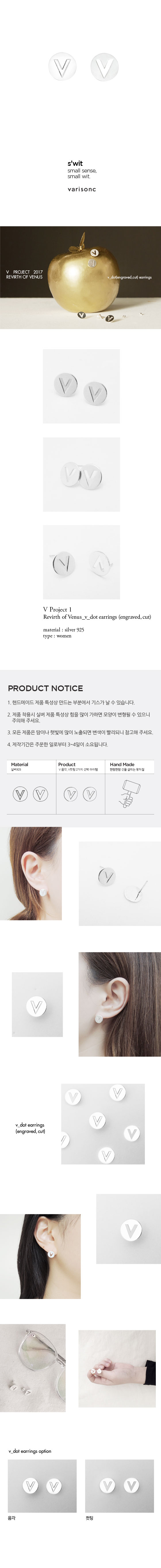 - 주문시 유의사항 : - 제작기간은 주문한 일로부터 3~4일이 소요됩니다. - 핸드메이드 제품 특성상 만드는 부분에서 기스가 날 수 있습니다. - 실버제품 특성상 힘을 많이 가하게 되면 모양이 변형될 수 있으니 주의해 주세요. - 제주 및 도서산간 지역은 추가배송비(3,000원)가 부과됩니다. Revirth of Venus_v.dot Earrings 모난 데 없이 모두를 아우르는 동그라미에 V가 새겨진 v.dot Earrings는그 어떤 이어링과도 잘 어울릴 베이직한 제품입니다. 심플한 스타일로 즐긴다면 한 쌍의 v.dot Earrings로, 화려한 제품과 함께한다면 밸런스있는 연출이 가능한 아이템입니다.