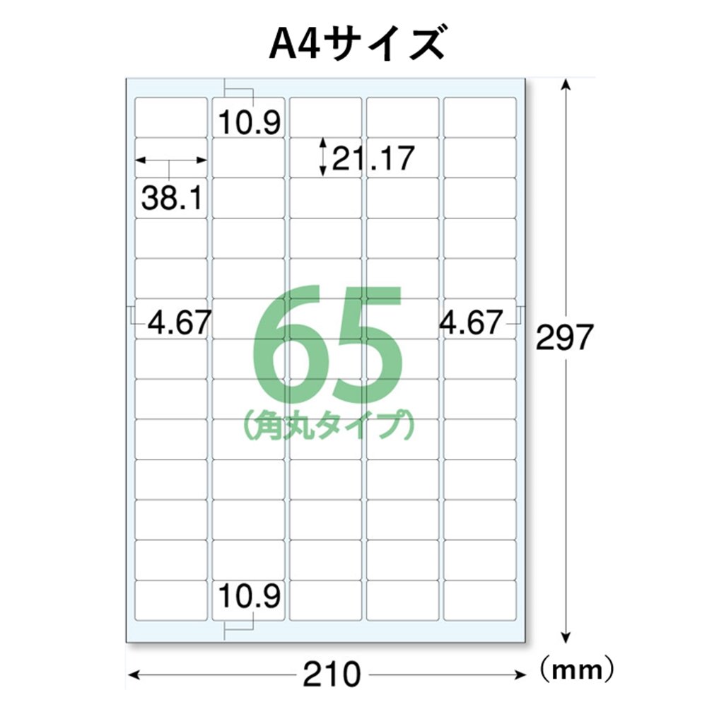 下地が透けない特殊加工で、貼る場所を選ばない宛名・表示ラベルです。 メーカー型番 : EDT-TM65R 用紙サイズ : 幅210mm×高さ298mm(A4サイズ) 一面サイズ : 幅38.1mm×高さ21.17mm ラベル枚数 : 1300枚(65面×20シート)