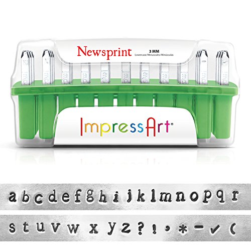 ImpressArt alphabet metal stamps are manufactured to the highest standard for stamping jewelry and crafts. The side of each metal letter stamp is labeled with the letter for easy identification and orientation. All stamps have an oil-free plated finish to protect against rust. ImpressArt's Newsprint metal letter stamps are old-fashioned and modern all at once. This classic, vintage style set- designed for easy readability- will ensure your stamped metal jewelry and crafts are read loud and clear, and that your works are nothing short of newsworthy. Each letter set comes in ImpressArt's sleek storage case. The case features labeled slots for each stamp to keep them organized and for easy access.Feature