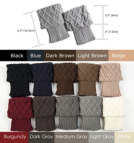 -. Feature : Various 8 Colors Black, Blue, Dark Brown, Light Brown, Beige, Burgundy, Light Gray, White, You can take your pick on what works with your outfit / Cable-knit cuffs with ribbed openings cushion the tops of boots and add additional stylish and warmth / Soft acrylic knit material keeps you warm & cozy Cuffed tops & bot stay snug in place / OSFW, Reversible, Machine Wash / Fun and stylish boot accessory for any occasion any season