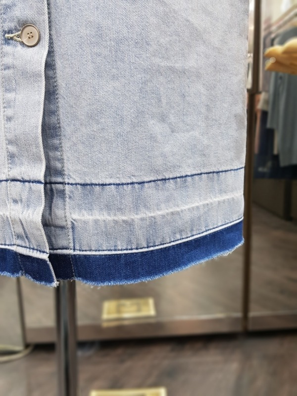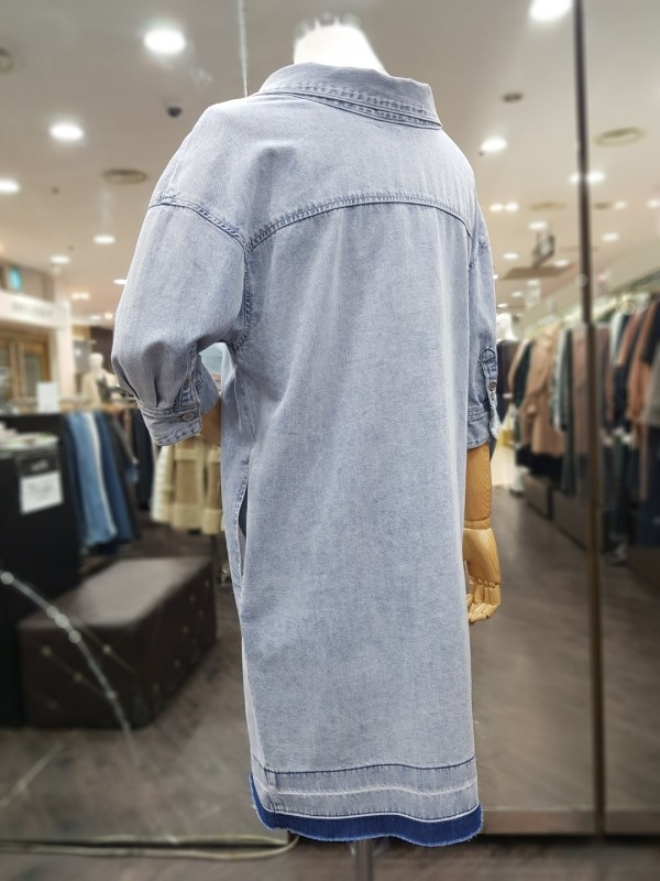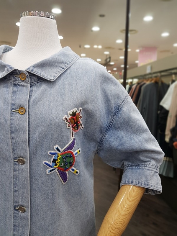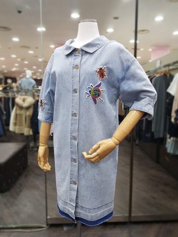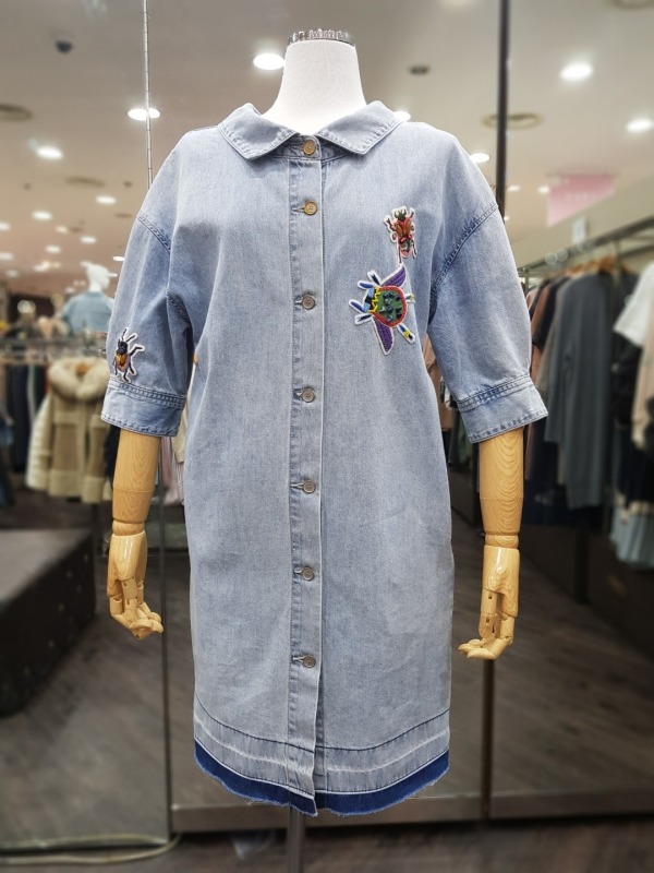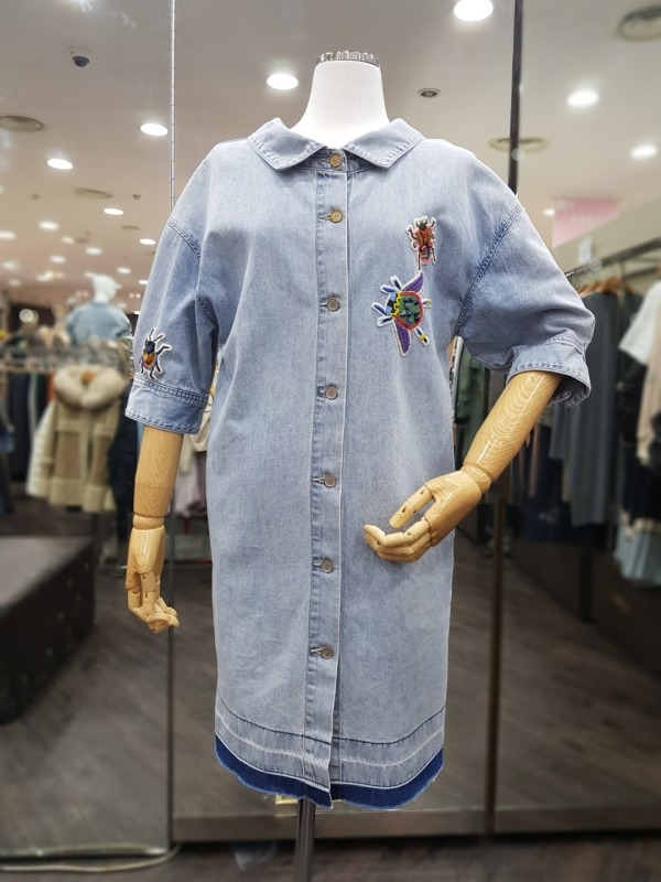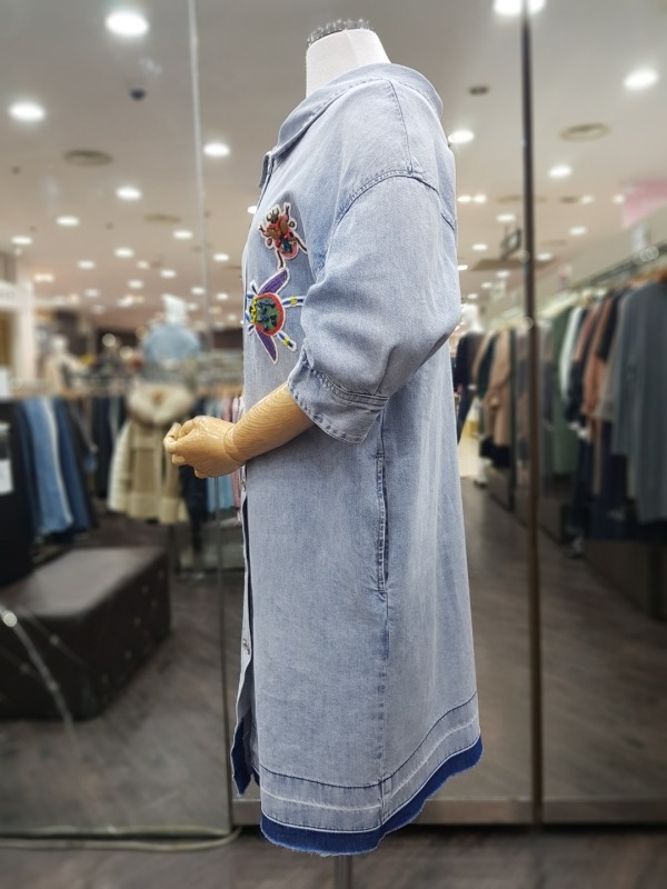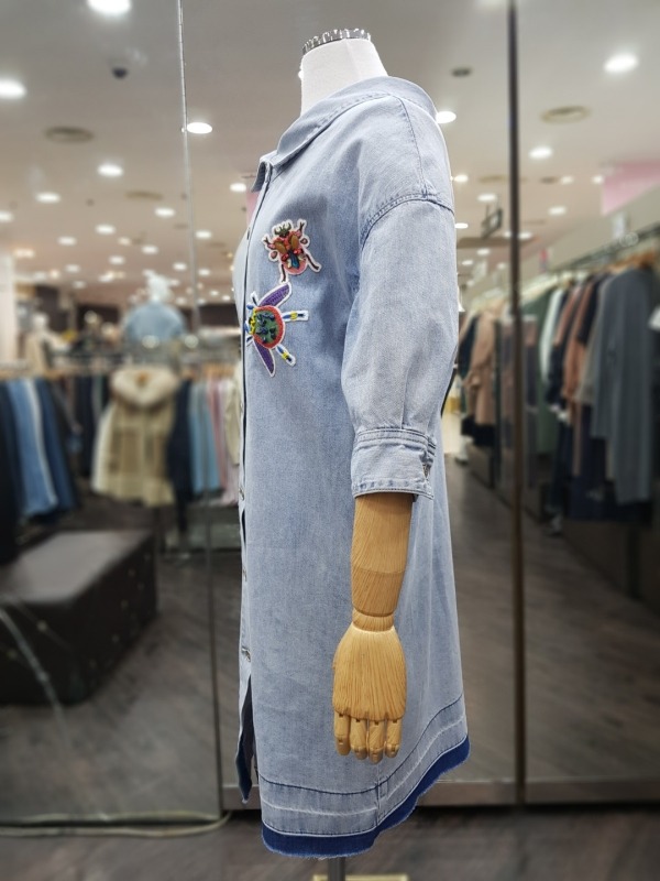 80CM 기장의 넥나인이 독특한 데님 자수 패치 원피스로,오픈하여 아우터로도 착용이 가능합니다.