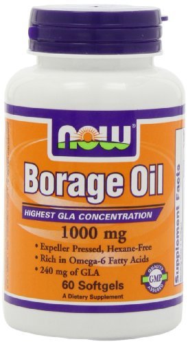 Borage Oil 240mg by Now Foods 240 Softgel Borage Oil is a nutritional oil containing over 80 polyunsaturated fats. Linoleic acid and Gamma Linoleic acid (GLA) are enhanced essential fatty acids. Although the body can manufacture GLA from dietary linoleic acid it can be more efficiently utilized for body functions when supplied directly by dietary source. Borage Oil is a more concentrated source of GLA than Evening Primrose Oil (EPO). One Borage Oil capsule is equilvalent to about 5 standard EPO capsules in GLA content.
