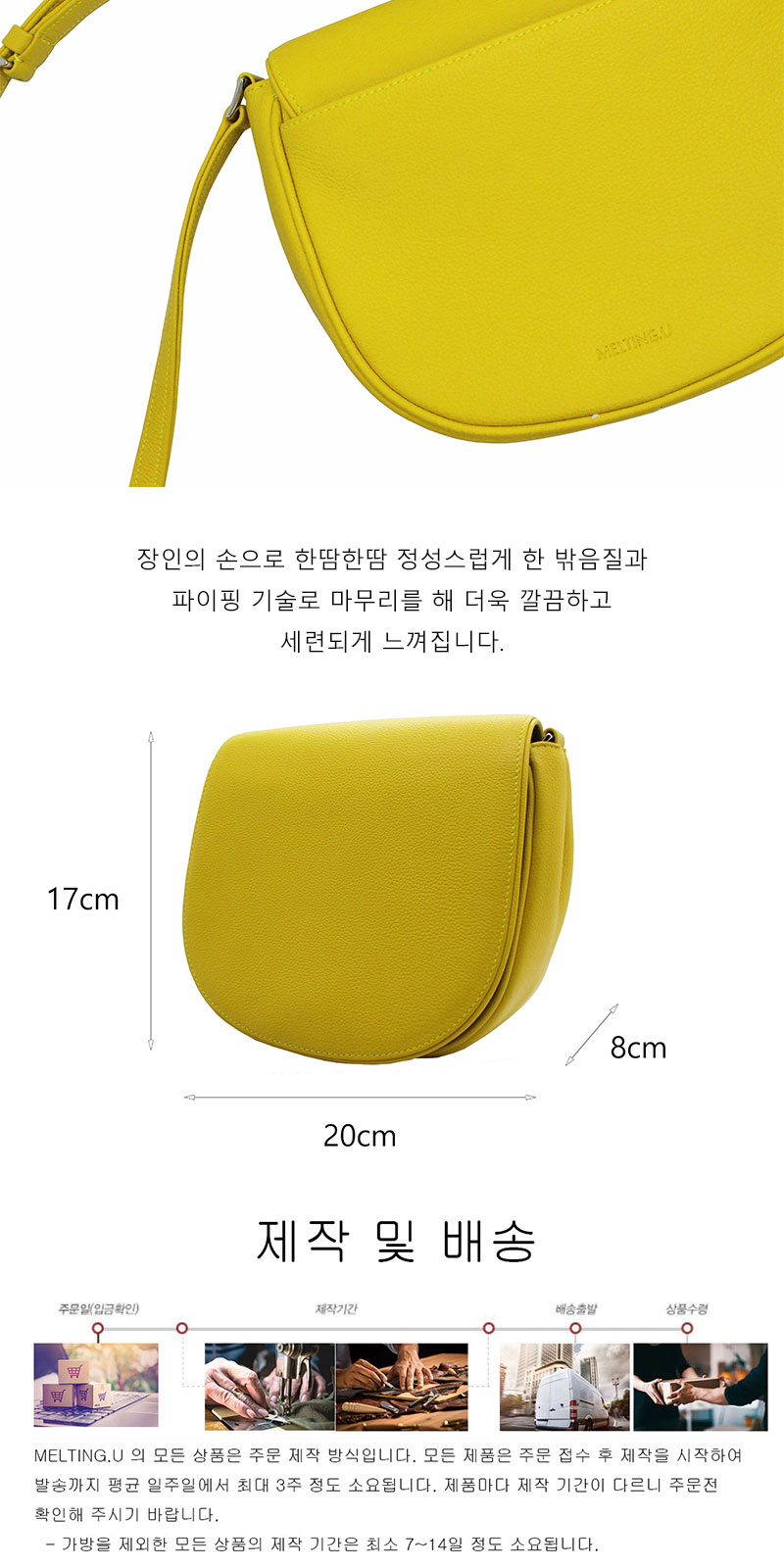 멜팅유의 모든 제품은 주문 후 제작 시스템으로 진행 되고 있습니다.가방의 경우 2~3주 정도의 제작 기간이 소요됩니다. 다만 급하게 필요하신 분들은 멜팅유 고객센터로 연락을 주시면 최대한 맞춰 드리겠습니다.