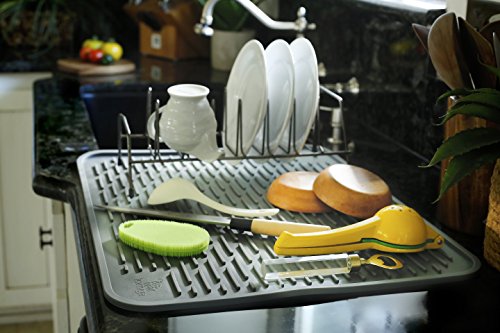 XXL Dish Mat 23" x 18" (LARGEST MAT) Durable Silicone Dish Drying Pad With Stay Clean Scrubby | Anti-Bacterial, Dish Washer Safe | Heat Resistant Trivet | (Grey)