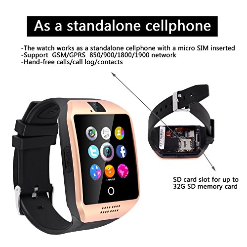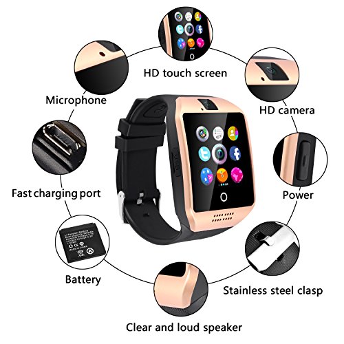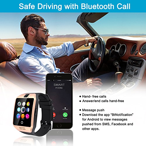 -. Feature : ••【Multi-Function】:Dial via watch SIM or Bluetooth , Pedometer, Calories burnt, Sedentary reminder, Sleep monitor, Remote photos, Music player, Alarm clock, Two-way auto-loss reminder, alarm clock, voice recorder, multi-time zone, multi-language, daylight saving time and message push from Facebook, Twitter, email, calls, texts, etc. Full compatibility for ANDROID and partial for IPHONE (Please refer to the Function Chart before you place the order) / •【More Comfortable】:STAINLESS steel finish, Precision laminating process, Nano TPU85 material strap, anti-sweat matte treatment, ergonomic arched design and soft strap enhance comfort for you. Life Waterproof, the smart watch surface can resist rainwater impact when you are in outdoor. / •【Works Over Your Expectation】:seamless connection to your smartphones and epeaker phone. The voice of this watch cell phone is clear and loud. Listen to music and make hand-free calls from your wrist. / •【Long-Lasting Battery life】:500mAH lithium battery, 2-day standby. / •【What You Get】: One piece Q18 Free Battery and 3-years worry-free product guarantee which ensure long-lasting enjoyment of your smartwatch