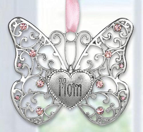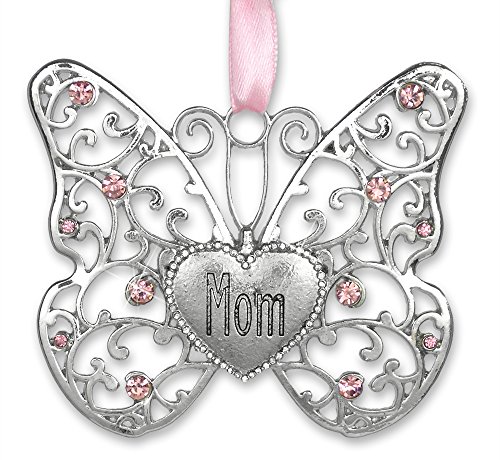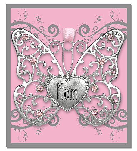 Mom Butterfly - Silver Filigree Butterfly with Pink Crystals - Engraved with Mom on the Heart Charm - 3"W x 2.75"H - Gifts for Mom - Mom's Birthday Gifts