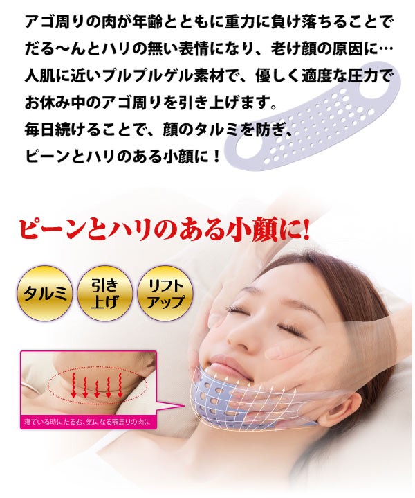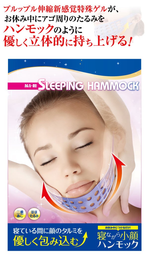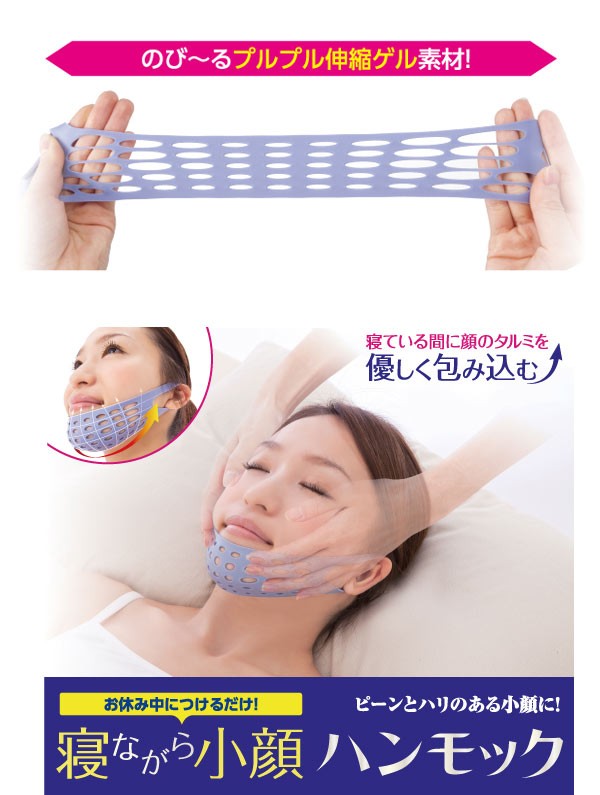 | <h1>寝ている間に顔のたるみをケアする「寝ながら小顔ハンモック」。人肌に近いゲル素材を使っているのでリフトアップしながらも着け心地は快適。毎日続けることで顔のたるみを防ぎ、ピーンとハリのある小顔に!</h1> |