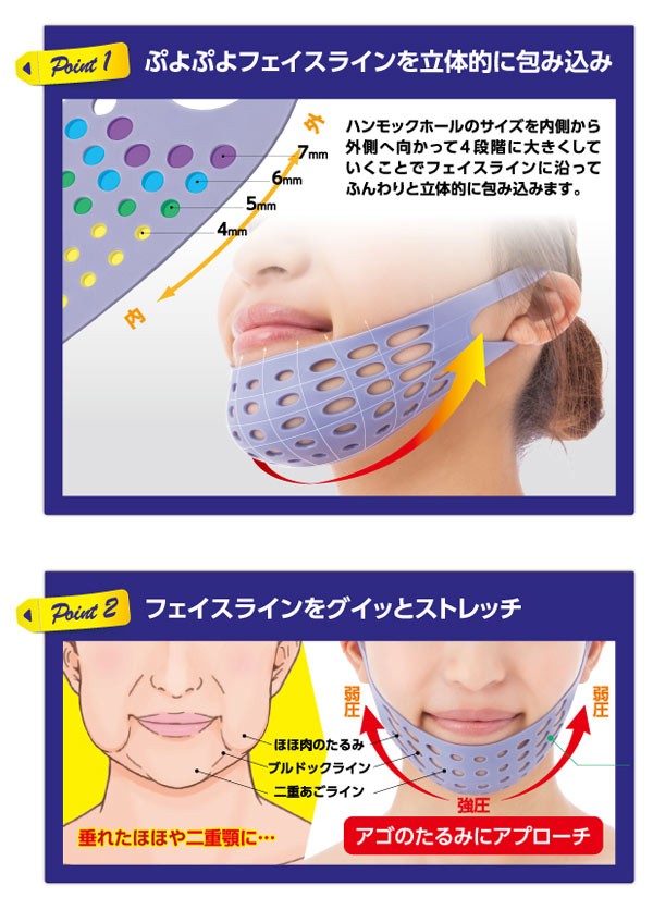 | 寝ている間に顔のたるみをケアする「寝ながら小顔ハンモック」。人肌に近いゲル素材を使っているのでリフトアップしながらも着け心地は快適。毎日続けることで顔のたるみを防ぎ、ピーンとハリのある小顔に! |