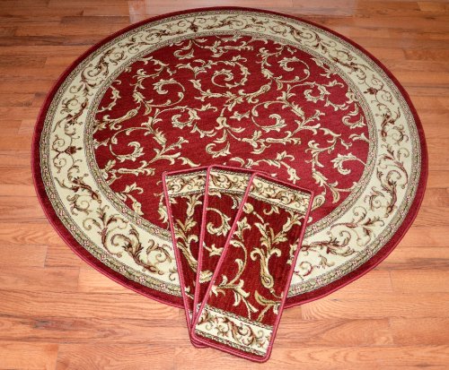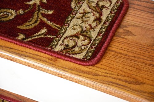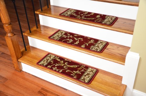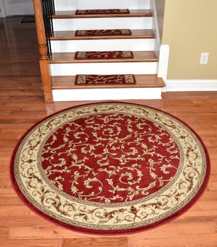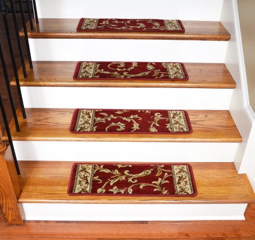 -. Brand : Dean Flooring Company -. Color : Red -. Feature : High fashion design with beautiful scroll sork / 13 Stair treads plus 5'3" round matching rug / Helps prevent slips on your hardwood stairs / Soft, warm, and comfortable / Edges are finished on all sides with attractive color matching yarn / Matching runners are available. -. Label : Dean Flooring Company -. Manufacturer : Dean Flooring Company -. MPN : ST32 -. PartNumber : ST32 -. ProductGroup : BISS -. ProductTypeName : LAB_SUPPLY -. Publisher : Dean Flooring Company -. Size : 26" x 9" stair treads plus 5'3" round -. Studio : Dean Flooring Company -. Title : Dean Premium Carpet Stair Treads - Red Scrollworks - Plus 5' 3" Round Landing Rug