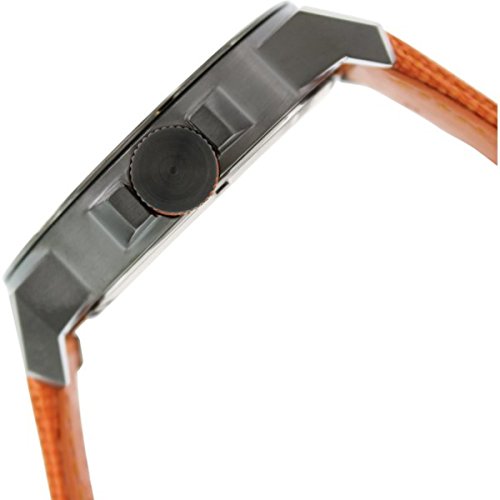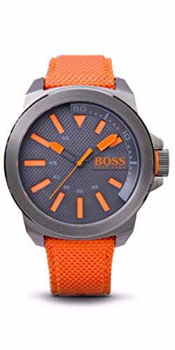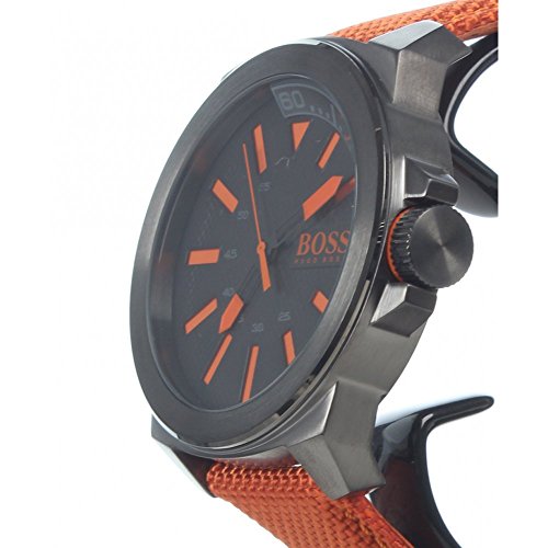 Large watch featuring round textured dial with rectangular logo inset at three o^^clock, contrasting orange markers, and luminous hands