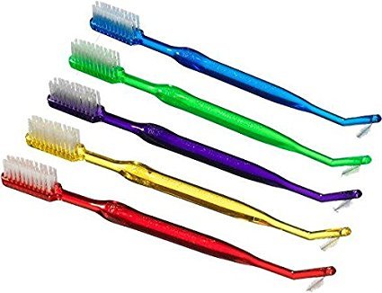 -. Feature : These dynamic dual-head, v-trimmed toothbrushes feature 43 tufts of soft bristles and a durable interproximal brush at end of the handle. / Dual-Head 4 Row Toothbrush / The nylon bristles are polished and end-rounded for a comfortable brush, and the textured thumb grip gives the user better control. / Bristles are firmly anchored with copper wire, and these bracket-straddling toothbrushes make it easy to keep teeth and braces clean. / 4 Toothbrushes per order. - Colors vary