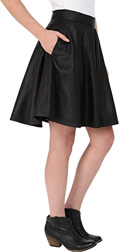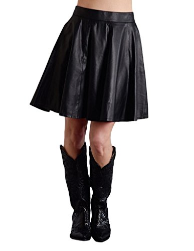 Flirty A-line silhouette. Banded waist. Exposed back zipper closure. Straight hem hits above the knee. 100% leather;