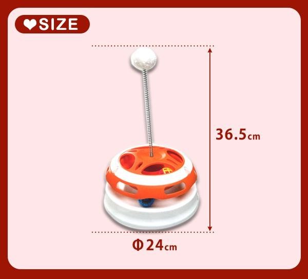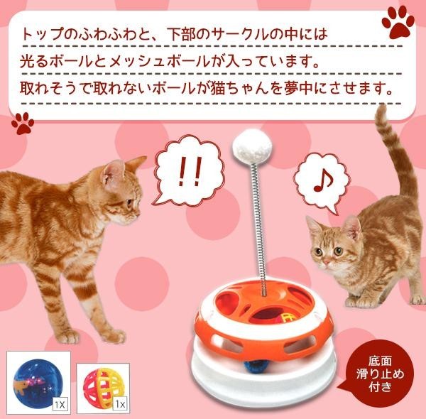 | トップのふわふわと、下部のサークルの中には光るボールとメッシュボールが入っています。取れそうで取れないボールが猫ちゃんを夢中にさせます。 |