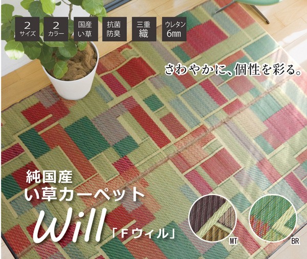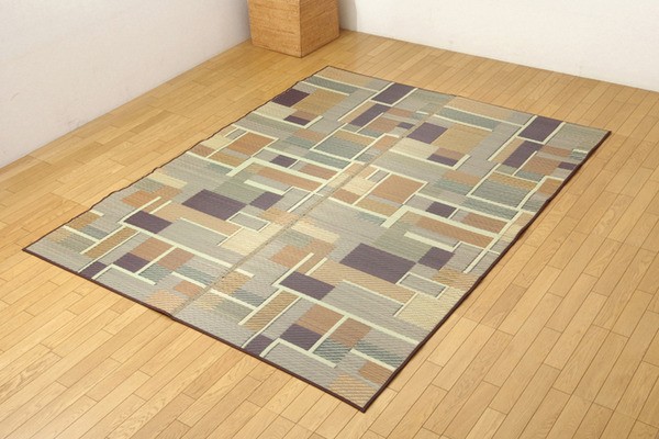 ウィルトンカーペットのような幾何柄でカラフルなデザインのい草ラグカーペットです。フローリングでもご使用できるよう、裏地にはウレタンフォームを使用しているためクッション性のある商品です。洋室にも合いやすいように柄はカラフルで明るく、シンプルなものにしました。国産(九州産)のい草を使用しています。一本一本が太く、表皮が厚く繊維がキメ細かいので弾力性があり、耐久性に優れています。い草には空気の自然浄化作用、湿度の調節作用などがあります。また汚れにくく、使用するうちに黄金色に変化し味が出ます。い草に青森ヒバ加工を施しています。(抗菌、防臭効果)