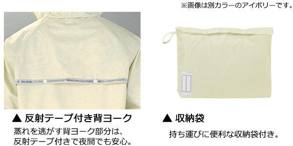 | メッシュ裏地で蒸れにくく、サラッと快適です。背部ヨークに反射テープが付いておりますので、夜間でも安心です。フードは取り外すことができます。持ち運びに便利な収納袋付き。 |