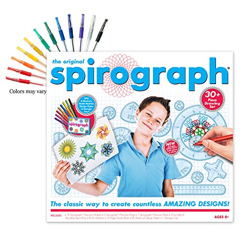 WHAT'S INCLUDED: (12) Gel Pens (19) Spirograph Precision Wheels, (2) Spirograph Precision Rings, (1) Spirograph Precision Rack, 21 oz of Reusable Spiro-Putty, (8) Art Markers, (1) 14-P Guide Book, (20) Sheets of Design Paper and (1) Storage Tray.