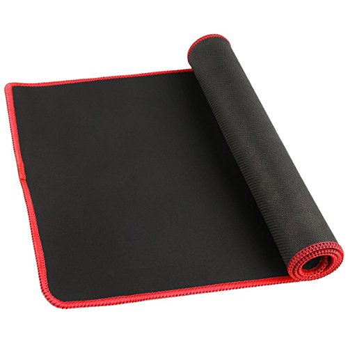 -. Feature : Large, smooth surface area allow better mouse movement / Large size design (23.6*11.8*0.1inches) makes it provide larger area fits both for keyboard and mouse. / It is Durable Anti-fray red stitching surrounds mouse pad to increase durability / Ultra-smooth surface make your exceptional tracking performance and aiming precision with optical and laser technology / Stability is very good and Non-slip rubber material base that provides heavy grip preventing sliding or movement of mouse pad