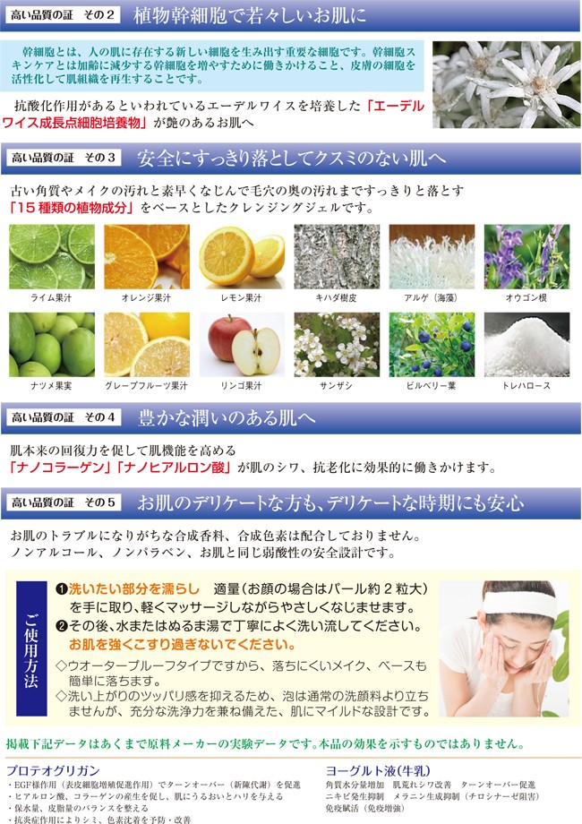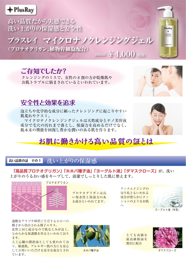 プラスレイ化粧品 マイクロナノ クレンジングジェル 200ml洗い上がりの保湿感!すべすべ感!天然素材だからできる信頼性! プロテオグリカン、植物幹細胞、ヨーグルト液、15種類の植物エキスなどを配合した高品質のクレンジングジェルです。豊かな潤いのある肌、クスミのない肌を目指します。お肌のトラブルになりがちな合成香料、合成色素は配合しておりません。ノンアルコール、ノンパラペン、お肌と同じ弱酸性です。泡立ちや化学的な成分に頼ったクレンジングに起こりやすい肌荒れやクスミに対応。マイクロナノクレンジングジェルは天然成分とナノ美容液成分で毛穴の汚れまで落とし、保湿力を高めるだけでなく、肌本来の機能を回復し豊かな潤いのある肌を作ります。◆主要成分植物エキス15種,ナノコラーゲン,ナノヒアルロンサン,水溶性プロテオグリカン,エーデルワイス,ビタミンE◆使用方法1.洗いたい部分を濡らし、適量(顔全体はパール約2粒大)を手に取り、軽くマッサージしながら優しくなじませます。2.その後、水、又はぬるま湯で丁寧に洗い流してください。お肌を強くこすり過ぎないようにご注意ください。