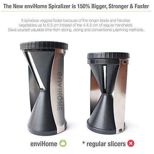 - Feature : 150% BIGGER, 50% LESS WASTAGE - This vegetable slicer is stronger and definitely durable than commonly sold slicer. The slicer is bigger which means it can accommodate bigger vegetables like up to 6.5cm bigger in diameter which will not fit in normal sized spiralizer. This innovative spiral vegetable slicer uses new deep-penetrating cap design which in turn creates 50% less vegetable waste. / FOUR INTERCHANGEABLE BLADES - The easy to use and very handy spiral slicer can create four different spiral slicer styles like ribbons and Julienne spirals, even chips. It can also produce different slicing sizes. The spiral slicer promises no clogging or jamming. Thanks to its high-end design and very sharp stainless steel blades from Japan. The blades of the spiralizer are also rust-free. / GET HEALTHY - Create NOODLES and JULIENNE SPIRALS from a great variety of vegetables: Carrots, Zucchini, Cucumbers, Rutabagas, Turnips, Squashes, Radishes, Sweet And Regular Potatoes, and lots others. Encouraging someone to follow a healthier lifestyle and turn vegan is more fun when partnered with presentable and exciting vegetable salads and raw food. Losing weight could be more exciting and inspiring having attractive veggies served on the table; not only you, but the whole family. / FREE ACCESSORIES - The enviHome spiralizer boasts four blades that promises sharpness you have never seen before. It Comes in 4 julienne sizes: 3 mm, 5 mm, 10 mm, and max 70 mm (flat blade). It also comes with free accessories such as Ceramic Peeler + Flexible Cleaning Brush + detailed operating instructions. All these free accessories are designed to work very efficiently with our spiralizer. / SIMPLE-TO-USE CLEVER DESIGN - enviHome products are well known for its quality. Our vegetable spiral slicer are designed and manufactured with the promise of delivering top quality products. This non-toxic spiralizer can be operated by a simple turning motion similar to sharpening a pencil. With less effort, one can turn simple vegetables into interesting salad with various spiral shapes. The spiral slicer is user friendly, easy to wash and its ergonomic design will not eat too much storage space. LIFETIME GUARANTEE, this is totally risk-free buy; CLICK the Orange button to Order Now!