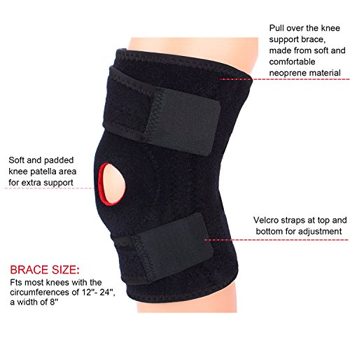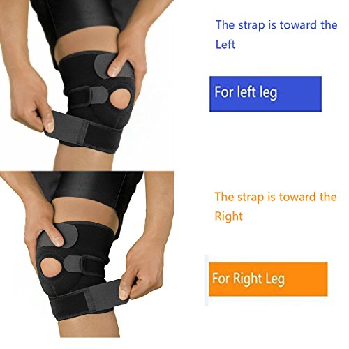 -. Feature : Fully Adjustable for Good Fit & Comfort - Velcro straps are adjustable so the brace fits to your own unique shape to provide the right level of support and compression required. This also means they tend to stay in place better than pull up sleeve braces. / Open Patella Wraparound Allow the Knee to Breathe - Has a hole at the front which reduces pressure on the kneecap which can be helpful when there is pain at the front of the knee. Ideal for tender, swollen or injured knees with a quick, easy application. / Provides Great Support and Compression - Made of stronger materials, it retains heat which increases the circulation to the knee which can help to promote healing, support the muscles and ligaments by providing compression to the knee. Perfect for moderate levels of support & for reducing forces through the knee. / Important Note: The difference of the right knee brace and left knee brace is the direction of the adjustable Velcro Straps,the strap of the right knee brace is toward right; However,the strap of the right knee brace is toward right.Please check the 2nd image on the detail paga before purchase. / 100% Hassle-free Money Back Guarantee - Fts most knees with the circumferences of 12''- 24 '', a width of 8¡±, fully Adjustable design accommodates users with different needs. Get back to running, jumping and dodging your opponent with the knee supports.
