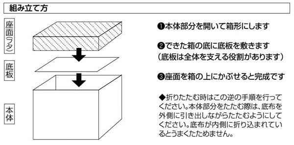 | 雑誌や身の回り品、おもちゃ等をすっきり整頓できて座れるBOXです。使わない時は折りたたんでコンパクトに。オットマンチェアとしてもご使用いただくことができます。 |