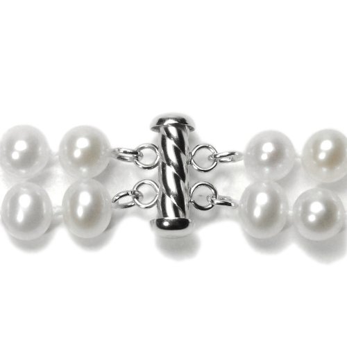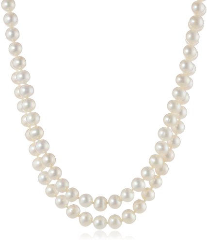 Prolific with pearls, this two-row necklace makes an exceptional gift. Radiant white freshwater cultured pearls, with diameters of 7.5 to 8mm, are double-knotted on silk cord to form two perfectly graduated strands with lengths of 17 and 18 inches. This necklace drapes beautifully and offers a sophisticated look and a gorgeous luster that will set off the most elegant ensemble. It closes with a decorative tube clasp made from bright and tarnish-resistant rhodium-dipped sterling silver.