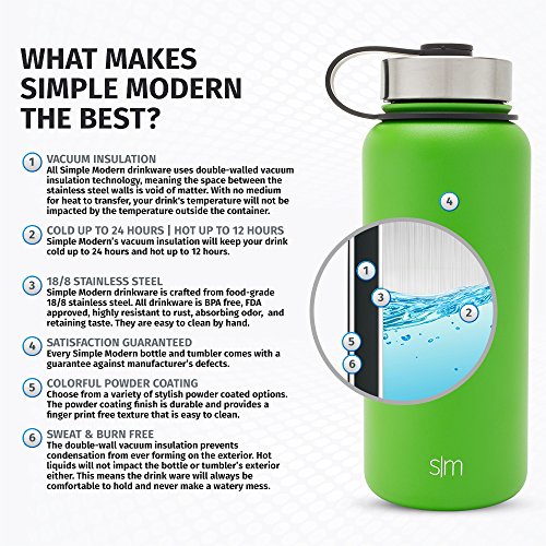 VACUUM INSULATED - The Simple Modern Summit water bottle is double-walled and vacuum insulated. This technology will keep you drink cold for up to 24 hours or hot up to 8 hours. This wide mouth reusable bottle will never sweat.