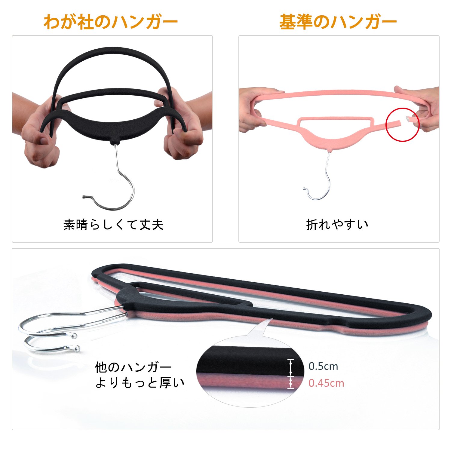 スチールハンガーよりもずっと軽く、また起毛ハンガーよりも耐久性が有る、いわば従来の『すべらないハンガー』の欠点を克服した、新しいハンガーです。