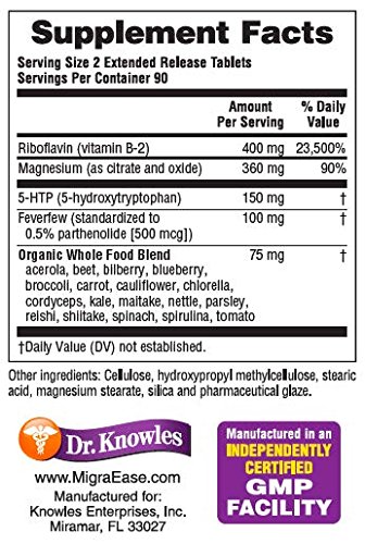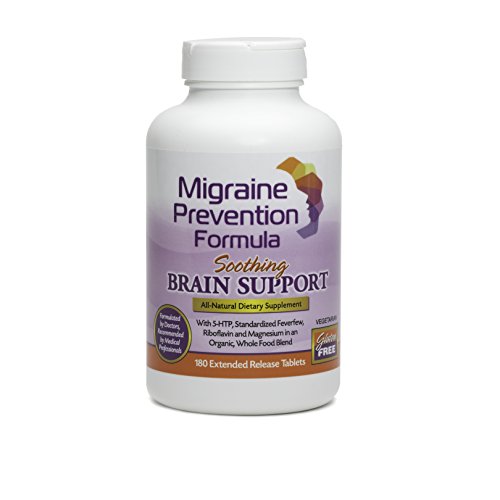 -. Feature : 180 Extended Release Caplets. Good for Migraines, women's monthly Menstrual Migraines, Chronic Headaches, Tension Headaches, Hormonal / Postmenopausal Migraines, Cluster Headaches, Chronic Daily Headaches, Hangover Headaches, and Caffeine-Withdrawal Headaches / PREVENT Migraine Headaches while you TREAT! The only supplement with four clinically proven ingredients. / No caffeine. All Natural, Gluten-Free, Organic, Vegetarian, Whole Food Blend - No wheat, soy, yeast, dairy or corn / Magnesium, Riboflavin (Vitamin B2), Feverfew, 5-HTP (5-Hydroxytryptophan) / Can be used with your current Migraine treatment.